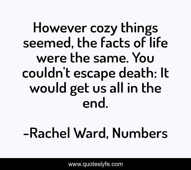 This page presents the quote "However cozy things seemed, the facts of life were the same. You couldn't escape death: It would get us all in the end.". Author of this quote is Rachel Ward, Numbers. This quote is about life, death, end, numbers, truth, escape, rachel-ward,.