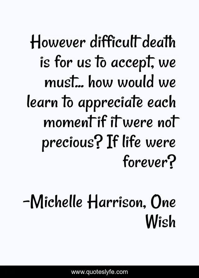 This page presents the quote "However difficult death is for us to accept, we must... how would we learn to appreciate each moment if it were not precious? If life were forever?". Author of this quote is Michelle Harrison, One Wish. This quote is about letting-go, acceptance, life, death, time,.