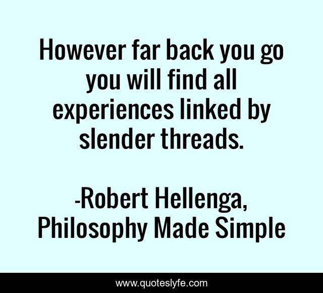 This page presents the quote "However far back you go you will find all experiences linked by slender threads.". Author of this quote is Robert Hellenga, Philosophy Made Simple. This quote is about life-experience, time,.