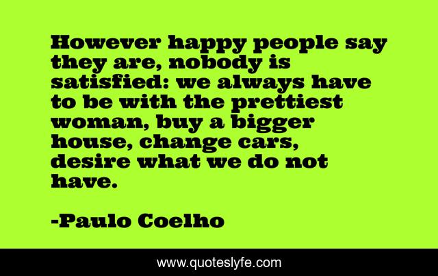This page presents the quote "However happy people say they are, nobody is satisfied: we always have to be with the prettiest woman, buy a bigger house, change cars, desire what we do not have.". Author of this quote is Paulo Coelho. This quote is about woman, change, happy,.