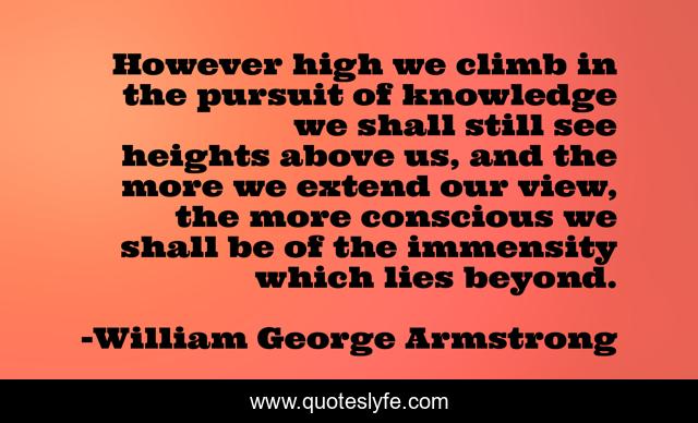 This page presents the quote "However high we climb in the pursuit of knowledge we shall still see heights above us, and the more we extend our view, the more conscious we shall be of the immensity which lies beyond.". Author of this quote is William George Armstrong. This quote is about uplifting, science, understanding, universe, knowledge, pursuit-of-knowledge,.