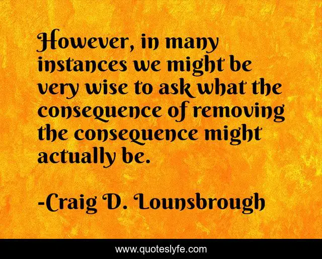 This page presents the quote "However, in many instances we might be very wise to ask what the consequence of removing the consequence might actually be.". Author of this quote is Craig D. Lounsbrough. .