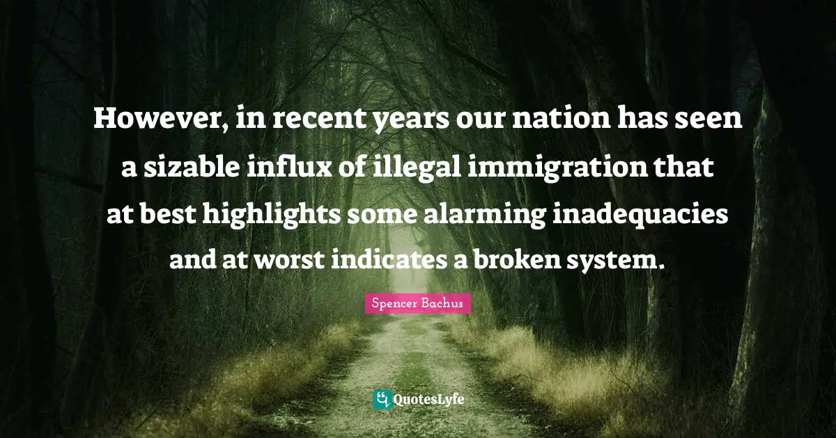 This page presents the quote "However, in recent years our nation has seen a sizable influx of illegal immigration that at best highlights some alarming inadequacies and at worst indicates a broken system.". Author of this quote is Spencer Bachus. This quote is about broken heart, highlights, years, worst, immigration, broken, illegal immigration,.