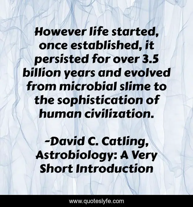 This page presents the quote "However life started, once established, it persisted for over 3.5 billion years and evolved from microbial slime to the sophistication of human civilization.". Author of this quote is David C. Catling, Astrobiology: A Very Short Introduction. This quote is about science, astrobiology, evolution,.