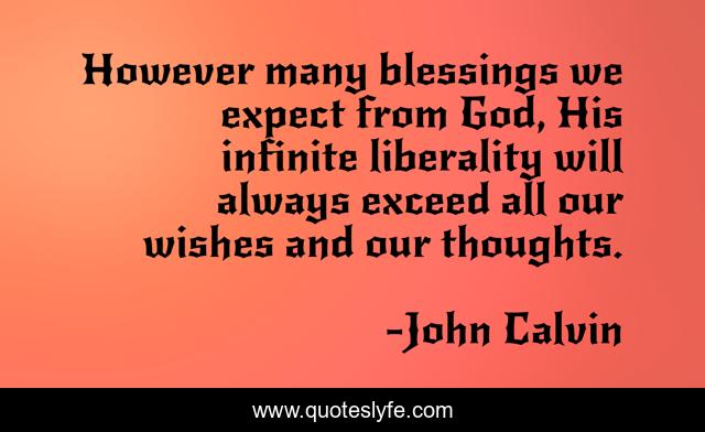 This page presents the quote "However many blessings we expect from God, His infinite liberality will always exceed all our wishes and our thoughts.". Author of this quote is John Calvin. This quote is about wishes, thoughts, blessings,.