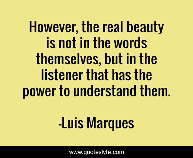 This page presents the quote "However, the real beauty is not in the words themselves, but in the listener that has the power to understand them.". Author of this quote is Luis Marques. This quote is about occult, kemet, magic, book-of-orion, power, asetian-bible, ak, magical, magick,.