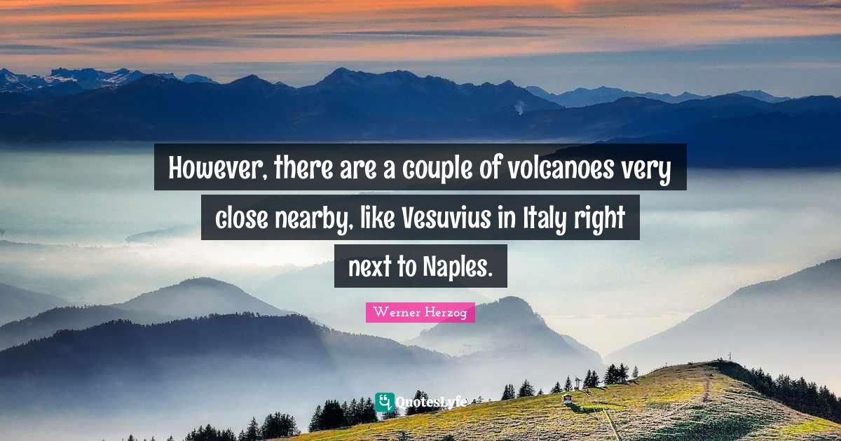 This page presents the quote "However, there are a couple of volcanoes very close nearby, like Vesuvius in Italy right next to Naples.". Author of this quote is Werner Herzog. This quote is about next, couple, volcanoes, naples,.