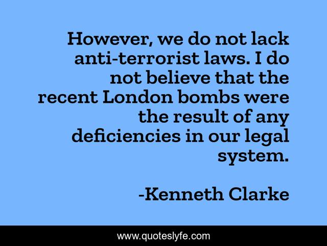 This page presents the quote "However, we do not lack anti-terrorist laws. I do not believe that the recent London bombs were the result of any deficiencies in our legal system.". Author of this quote is Kenneth Clarke. This quote is about believe, london, laws,.