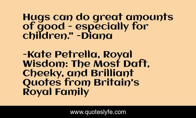 This page presents the quote "Hugs can do great amounts of good - especially for children." -Diana". Author of this quote is Kate Petrella, Royal Wisdom: The Most Daft, Cheeky, and Brilliant Quotes from Britain's Royal Family. .