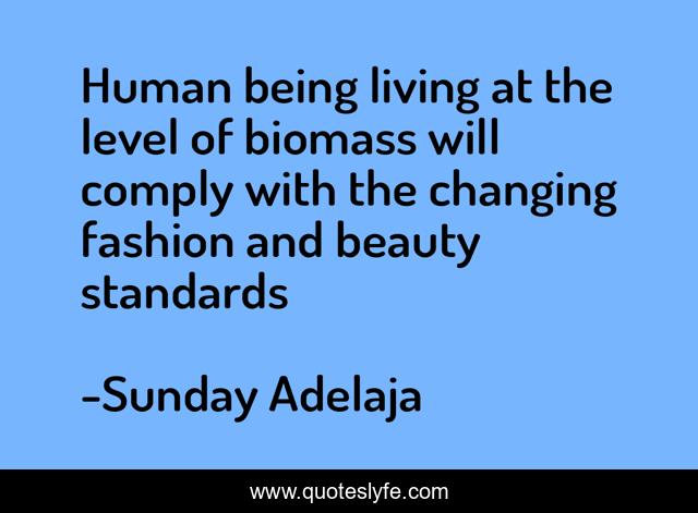 This page presents the quote "Human being living at the level of biomass will comply with the changing fashion and beauty standards". Author of this quote is Sunday Adelaja. This quote is about life, fashion, beauty, level, biomass, calling, purpose, truth, human-being,.