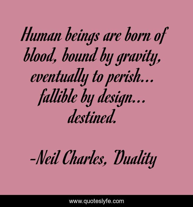 This page presents the quote "Human beings are born of blood, bound by gravity, eventually to perish... fallible by design... destined.". Author of this quote is Neil Charles, Duality. This quote is about forward, dystopian, theological, fiction,.
