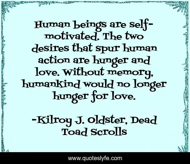 This page presents the quote "Human beings are self-motivated. The two desires that spur human action are hunger and love. Without memory, humankind would no longer hunger for love.". Author of this quote is Kilroy J. Oldster, Dead Toad Scrolls. This quote is about recollection, memories, recollections, reminiscence, memory,.