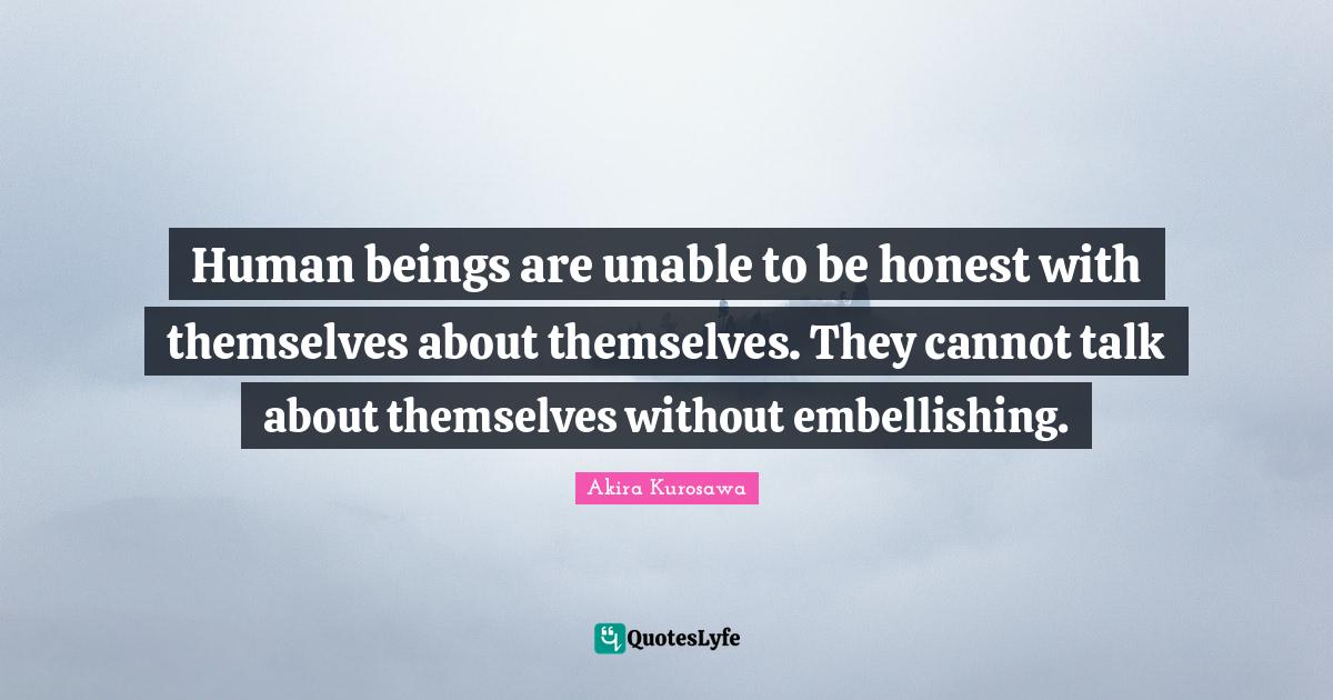 This page presents the quote "Human beings are unable to be honest with themselves about themselves. They cannot talk about themselves without embellishing.". Author of this quote is Akira Kurosawa. This quote is about honest, human beings, being honest, humans,.