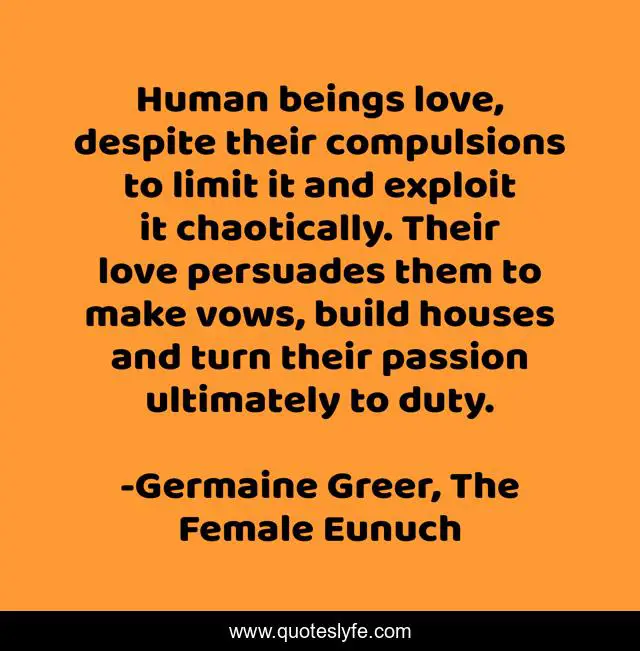 This page presents the quote "Human beings love, despite their compulsions to limit it and exploit it chaotically. Their love persuades them to make vows, build houses and turn their passion ultimately to duty.". Author of this quote is Germaine Greer, The Female Eunuch. This quote is about humans, love, affection,.