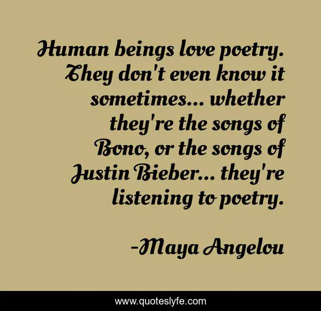 This page presents the quote "Human beings love poetry. They don't even know it sometimes... whether they're the songs of Bono, or the songs of Justin Bieber... they're listening to poetry.". Author of this quote is Maya Angelou. This quote is about love, listening, affection,.