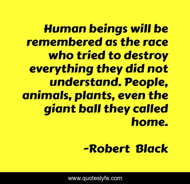 This page presents the quote "Human beings will be remembered as the race who tried to destroy everything they did not understand. People, animals, plants, even the giant ball they called home.". Author of this quote is Robert Black. This quote is about plants, earth, animals, people,.