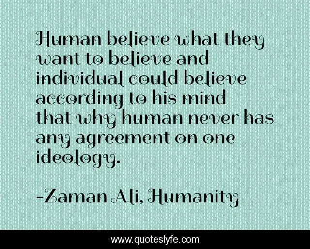 This page presents the quote "Human believe what they want to believe and individual could believe according to his mind that why human never has any agreement on one ideology.". Author of this quote is Zaman Ali, Humanity. This quote is about individuality, mind, agreement, ideology, human, believe,.