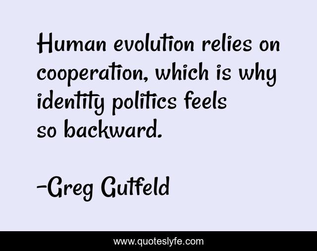 This page presents the quote "Human evolution relies on cooperation, which is why identity politics feels so backward.". Author of this quote is Greg Gutfeld. This quote is about evolution, why, identity,.