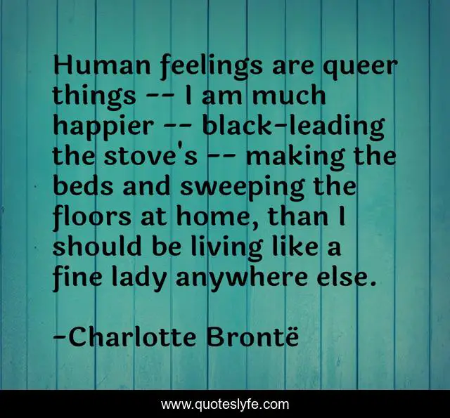 This page presents the quote "Human feelings are queer things -- I am much happier -- black-leading the stove's -- making the beds and sweeping the floors at home, than I should be living like a fine lady anywhere else.". Author of this quote is Charlotte Brontë. .
