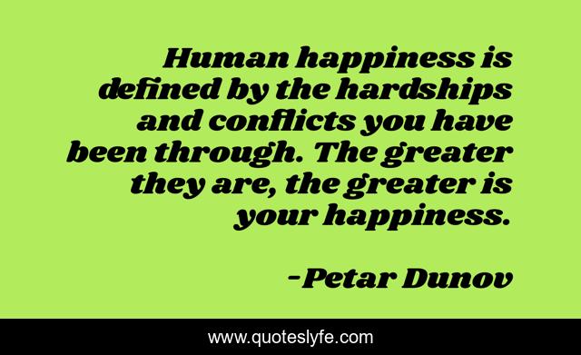 This page presents the quote "Human happiness is defined by the hardships and conflicts you have been through. The greater they are, the greater is your happiness.". Author of this quote is Petar Dunov. This quote is about conflicts, hardships, happiness,.