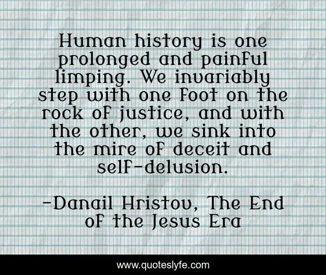 This page presents the quote "Human history is one prolonged and painful limping. We invariably step with one foot on the rock of justice, and with the other, we sink into the mire of deceit and self-delusion.". Author of this quote is Danail Hristov, The End of the Jesus Era. This quote is about deceit, human-history, justice, self-delusion,.