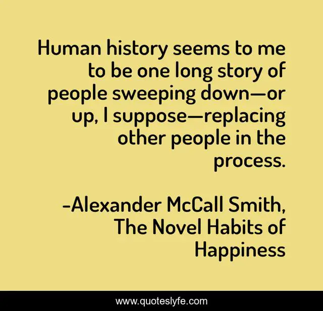 This page presents the quote "Human history seems to me to be one long story of people sweeping down—or up, I suppose—replacing other people in the process.". Author of this quote is Alexander McCall Smith, The Novel Habits of Happiness. This quote is about human-history, alexander-mccall-smith, history-repeating-itself, history-of-mankind, history,.
