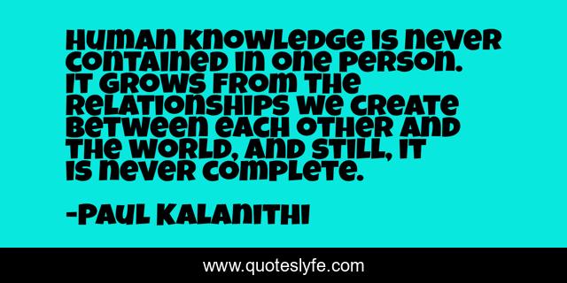 This page presents the quote "Human knowledge is never contained in one person. It grows from the relationships we create between each other and the world, and still, it is never complete.". Author of this quote is Paul Kalanithi. This quote is about relationships, world, human,.