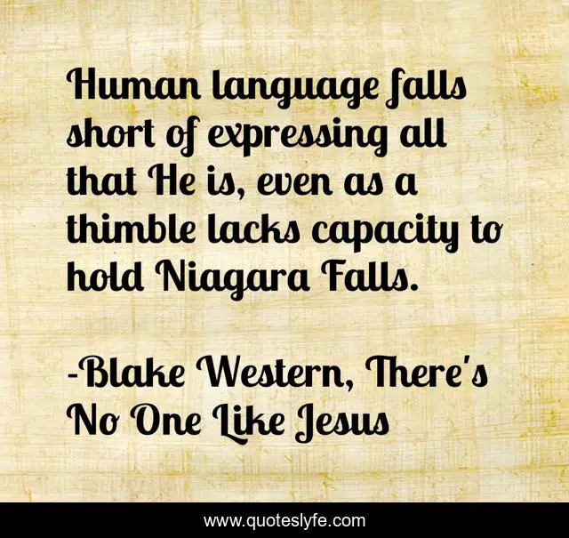 This page presents the quote "Human language falls short of expressing all that He is, even as a thimble lacks capacity to hold Niagara Falls.". Author of this quote is Blake Western, There's No One Like Jesus. This quote is about jesus-christ, god, amazing, jesus,.