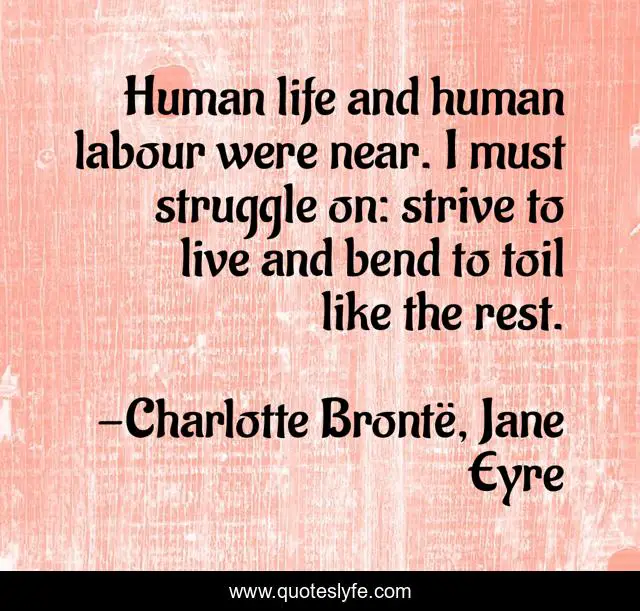 This page presents the quote "Human life and human labour were near. I must struggle on: strive to live and bend to toil like the rest.". Author of this quote is Charlotte Brontë, Jane Eyre. This quote is about working, society, inspirational, enthusiasm, life-and-living, humanity,.
