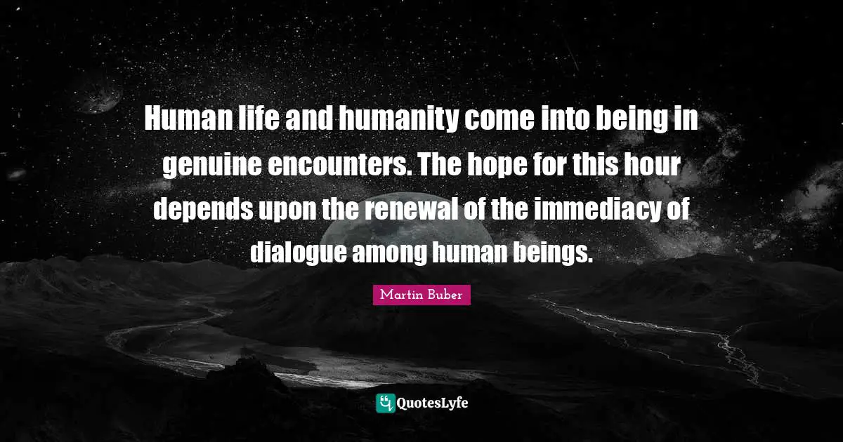 This page presents the quote "Human life and humanity come into being in genuine encounters. The hope for this hour depends upon the renewal of the immediacy of dialogue among human beings.". Author of this quote is Martin Buber. This quote is about humanity, human life, encounters, renewal, human beings, dialogue, genuine, hope, hours,.