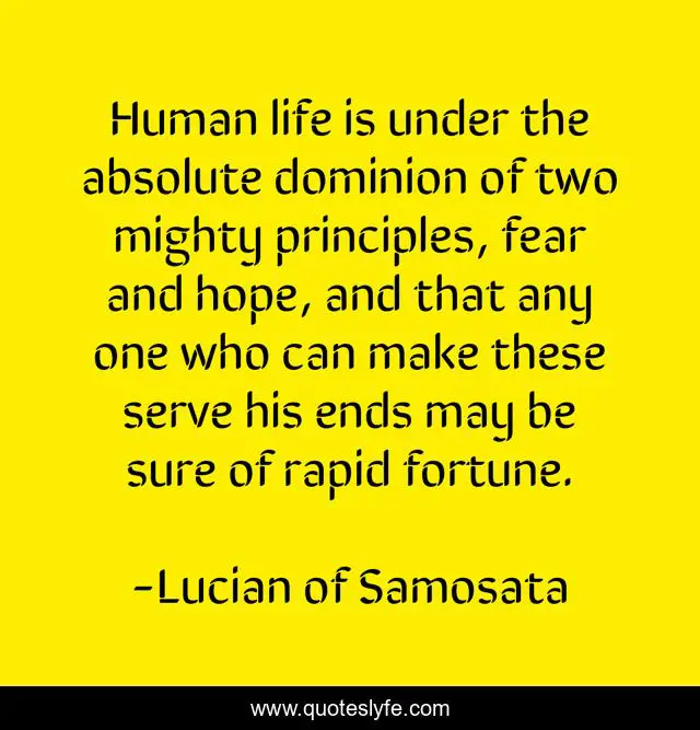 This page presents the quote "Human life is under the absolute dominion of two mighty principles, fear and hope, and that any one who can make these serve his ends may be sure of rapid fortune.". Author of this quote is Lucian of Samosata. This quote is about faith, fear, hope,.