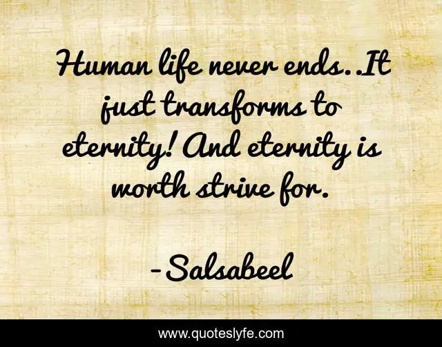 This page presents the quote "Human life never ends..It just transforms to eternity!And eternity is worth strive for.". Author of this quote is Salsabeel. This quote is about eternity, life, strive,.