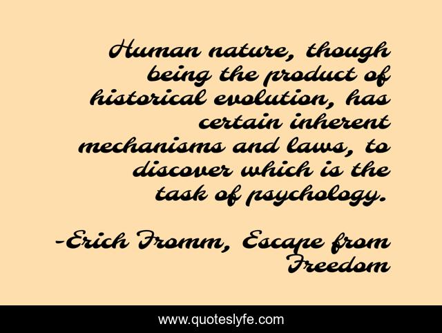This page presents the quote "Human nature, though being the product of historical evolution, has certain inherent mechanisms and laws, to discover which is the task of psychology.". Author of this quote is Erich Fromm, Escape from Freedom. This quote is about philosophy, psychology,.