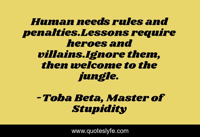 This page presents the quote "Human needs rules and penalties.Lessons require heroes and villains.Ignore them, then welcome to the jungle.". Author of this quote is Toba Beta, Master of Stupidity. This quote is about god, evil,.