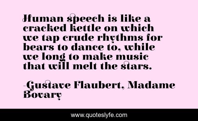 This page presents the quote "Human speech is like a cracked kettle on which we tap crude rhythms for bears to dance to, while we long to make music that will melt the stars.". Author of this quote is Gustave Flaubert, Madame Bovary. This quote is about abstraction, language,.