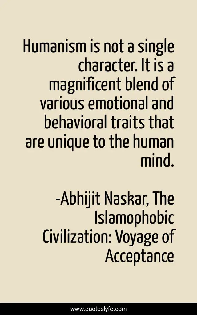 "Abhijit Naskar, The Islamophobic Civilization: Voyage of Acceptance Quotes." Quoteslyfe.com, 2025. Fri. 05 Dec. 2025. <https://www.quoteslyfe.com/quote/Humanism-is-not-a-single-character-It-103409>.