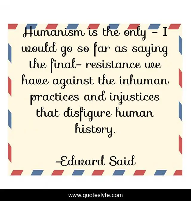 This page presents the quote "Humanism is the only - I would go so far as saying the final- resistance we have against the inhuman practices and injustices that disfigure human history.". Author of this quote is Edward Said. This quote is about humanism, resistance, human, history,.