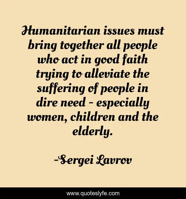 This page presents the quote "Humanitarian issues must bring together all people who act in good faith trying to alleviate the suffering of people in dire need - especially women, children and the elderly.". Author of this quote is Sergei Lavrov. This quote is about faith, good, children,.