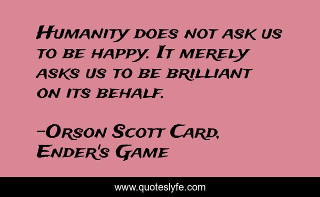 This page presents the quote "Humanity does not ask us to be happy. It merely asks us to be brilliant on its behalf.". Author of this quote is Orson Scott Card, Ender's Game. This quote is about mazer-rackham, humanity, happiness,.