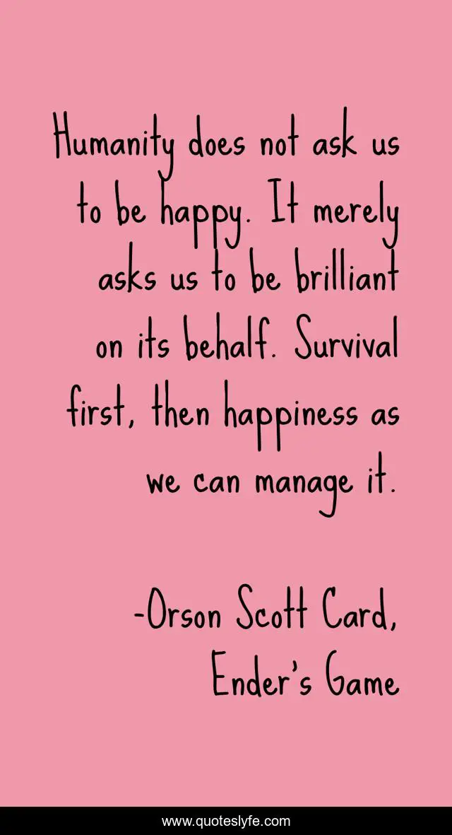 This page presents the quote "Humanity does not ask us to be happy. It merely asks us to be brilliant on its behalf. Survival first, then happiness as we can manage it.". Author of this quote is Orson Scott Card, Ender's Game. This quote is about society, survival, humanity, happiness,.