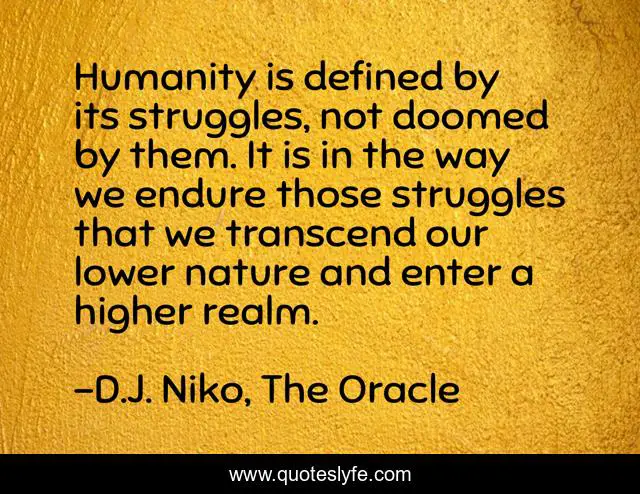 This page presents the quote "Humanity is defined by its struggles, not doomed by them. It is in the way we endure those struggles that we transcend our lower nature and enter a higher realm.". Author of this quote is D.J. Niko, The Oracle. This quote is about d-j-niko, sarah-weston-chronicles, the-oracle, enduring-struggles, struggle, humanity,.