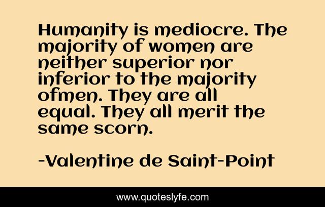 This page presents the quote "Humanity is mediocre. The majority of women are neither superior nor inferior to the majority ofmen. They are all equal. They all merit the same scorn.". Author of this quote is Valentine de Saint-Point. .