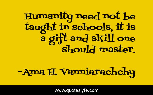 This page presents the quote "Humanity need not be taught in schools, it is a gift and skill one should master.". Author of this quote is Ama H. Vanniarachchy. This quote is about compassion, ama-h-vanniarachchy, humanity,.