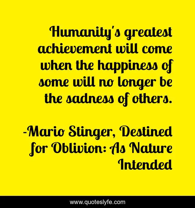 This page presents the quote "Humanity's greatest achievement will come when the happiness of some will no longer be the sadness of others.". Author of this quote is Mario Stinger, Destined for Oblivion: As Nature Intended. This quote is about achievement, sadness, happiness, inspirational, enthusiasm, hope,.