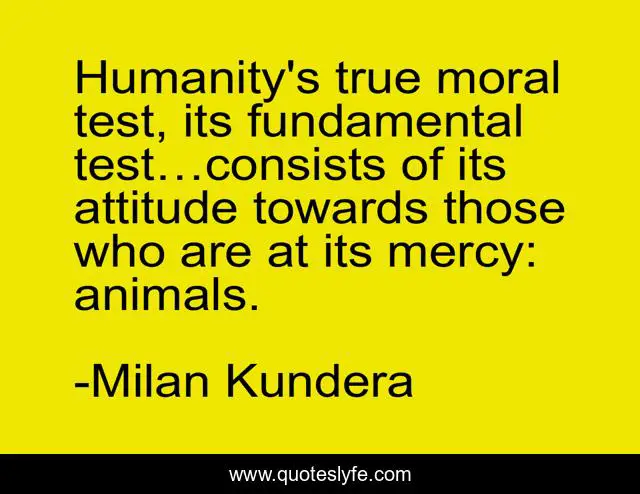 This page presents the quote "Humanity's true moral test, its fundamental test…consists of its attitude towards those who are at its mercy: animals.". Author of this quote is Milan Kundera. This quote is about animal-welfare, animals, animal-rights, animal-cruelty,.