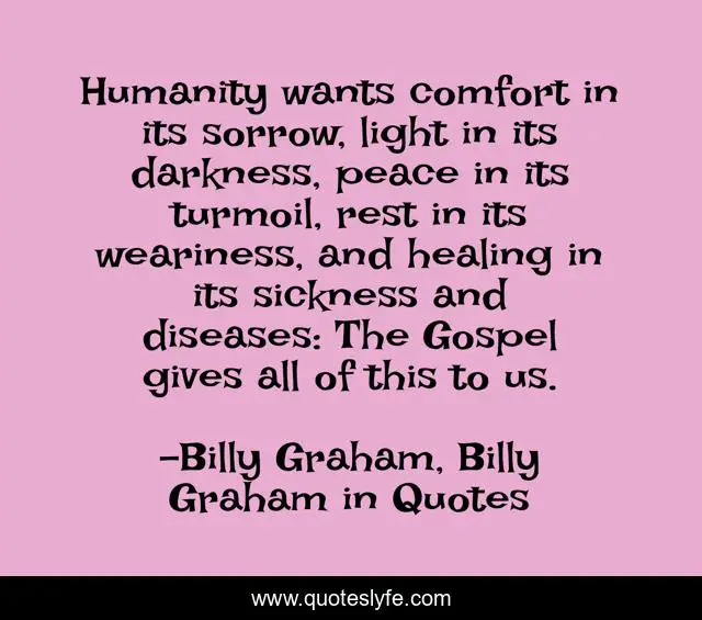 This page presents the quote "Humanity wants comfort in its sorrow, light in its darkness, peace in its turmoil, rest in its weariness, and healing in its sickness and diseases: The Gospel gives all of this to us.". Author of this quote is Billy Graham, Billy Graham in Quotes. This quote is about comfort, billy-graham,.