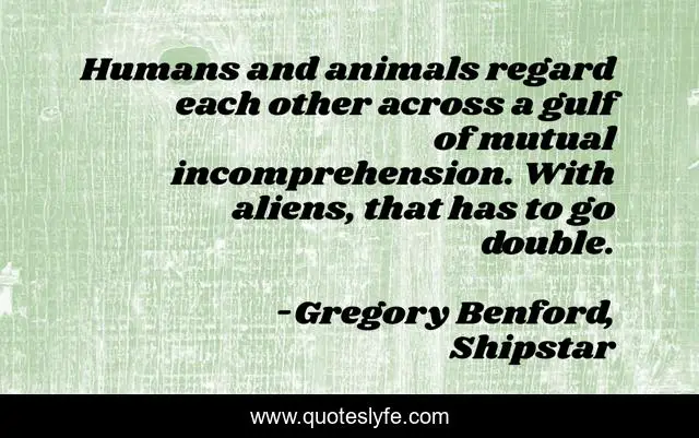 This page presents the quote "Humans and animals regard each other across a gulf of mutual incomprehension. With aliens, that has to go double.". Author of this quote is Gregory Benford, Shipstar. This quote is about animals, aliens, humans,.