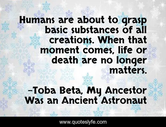 This page presents the quote "Humans are about to grasp basic substances of all creations. When that moment comes, life or death are no longer matters.". Author of this quote is Toba Beta, My Ancestor Was an Ancient Astronaut. This quote is about life, death, creation, basic-substance, secret, truth,.