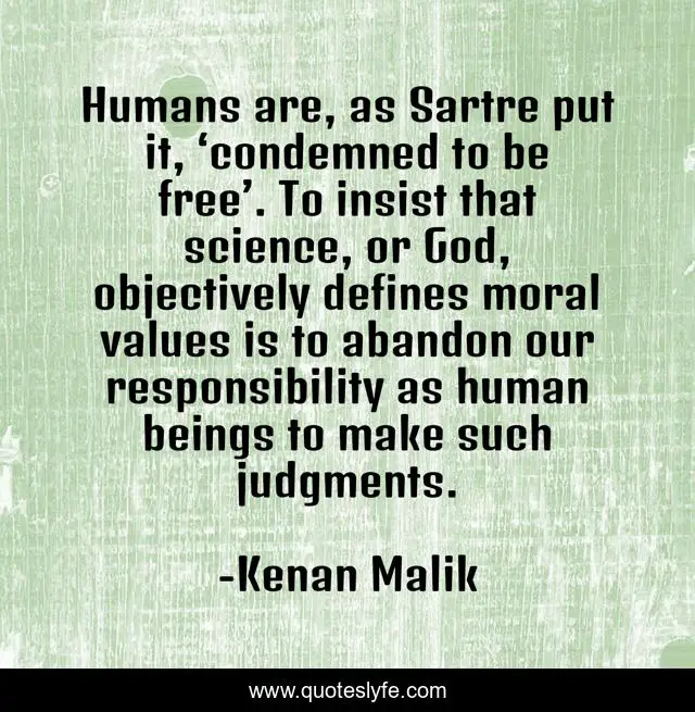 This page presents the quote "Humans are, as Sartre put it, ‘condemned to be free’. To insist that science, or God, objectively defines moral values is to abandon our responsibility as human beings to make such judgments.". Author of this quote is Kenan Malik. This quote is about eyjics, god, judgement, religion, values, science, humanity, morality,.