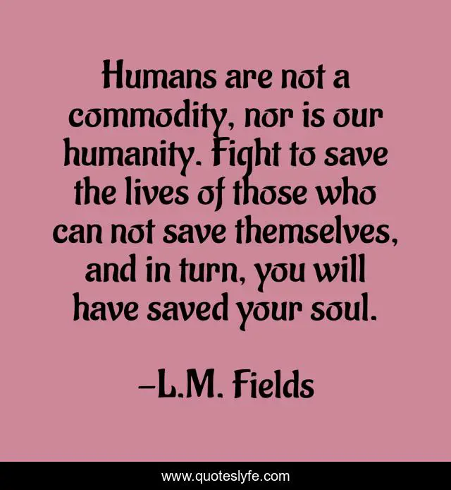 This page presents the quote "Humans are not a commodity, nor is our humanity. Fight to save the lives of those who can not save themselves, and in turn, you will have saved your soul.". Author of this quote is L.M. Fields. This quote is about humanity, integrity, honesty, truth, morality,.